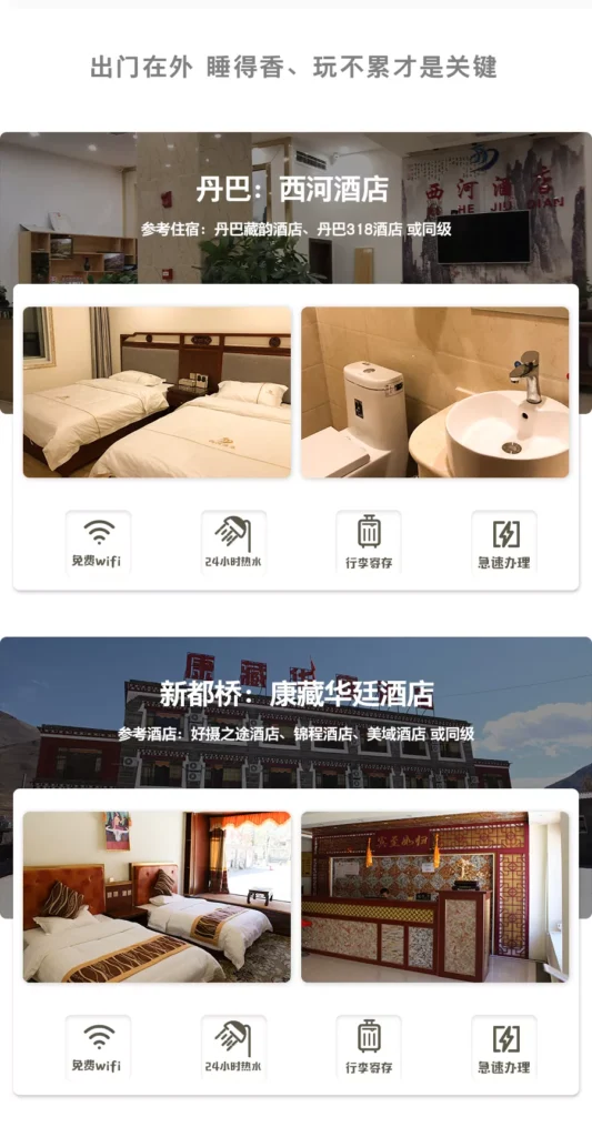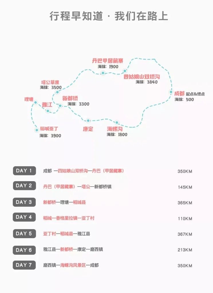 (1)因爲川西交通管制,具體線路走向以實際走向爲準,如遇前往四姑娘山堵車會走瓦丹路到丹巴,則放棄四姑娘山雙橋溝景點;如下午15:00前未抵達四姑娘山,則放棄四姑娘山雙橋溝景點,敬請理解。