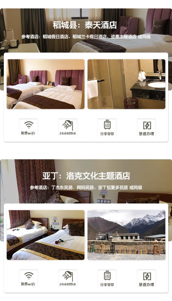 (2)亞丁村的住宿比較艱苦、條件非常落後,均爲民居改建的遊客接待點,請您做好相應心理準備,並理解這份純樸原始的“真、善、美”。季節性停水停電,不可避免,請提前準備手電,頭燈;
