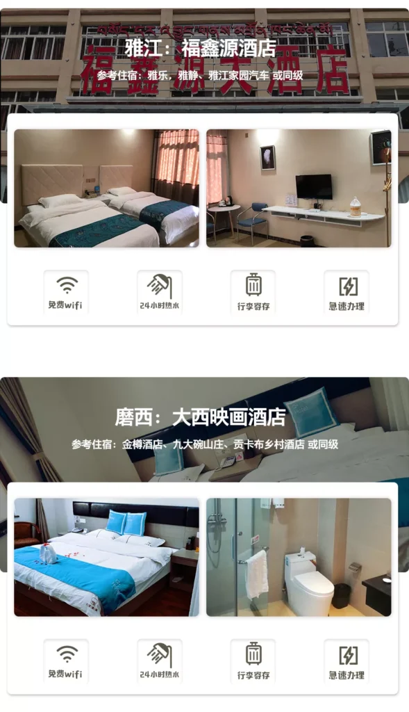 (2)到集合酒店報“大美川西+姓名”拿房,房費已付,押金自付。對於拼房的隊員,客服會將拼房者的電話互換。