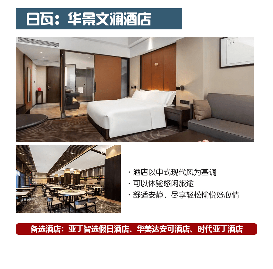 當日住宿:華景文瀾飯店、亞丁智選假日酒店、華美達安可飯店或同級