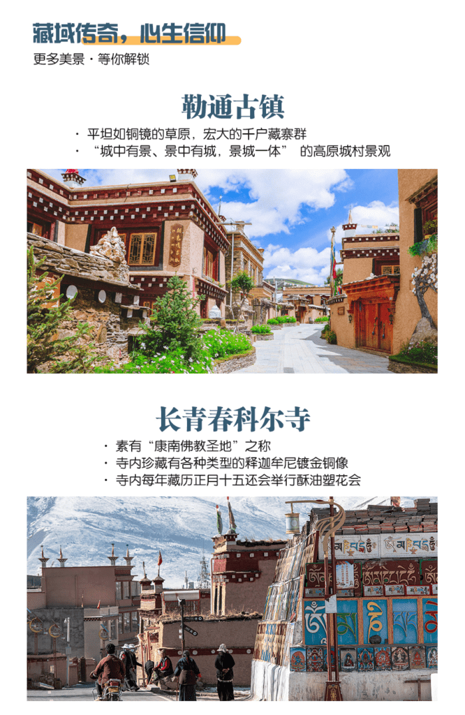 長青春科爾寺又稱理塘寺,1580年由三世達賴·索南嘉措開光建成。 歷史悠久,規模恢弘。 現為康區第一大格魯派(黃教)寺廟,素有康南佛教聖地之稱,地位與拉薩三大寺齊平。· 寺內可看到古老的佛經、班禪的坐床等稀世珍寶。 每年藏曆六月轉山節期間,寺廟會舉辦盛大的慶祝活動,熱鬧非凡。